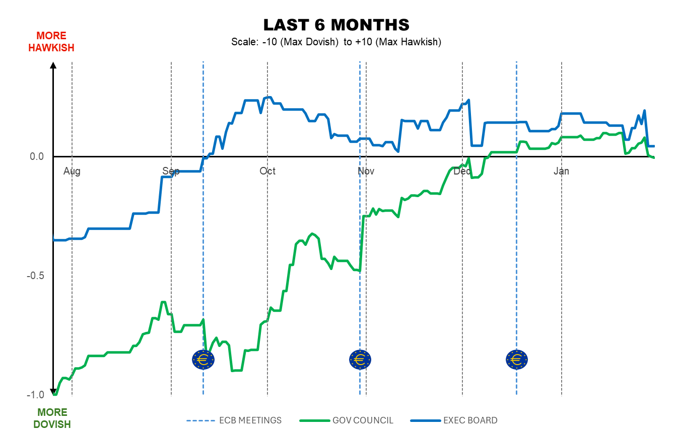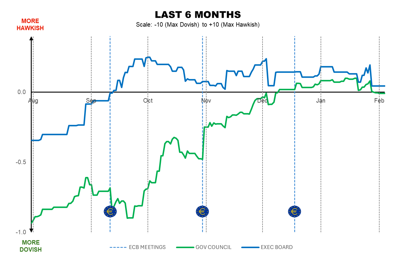 By Marta Vilar – MADRID (Econostream) – The ECB’s tone in our ECB Tone Meter moved slightly dovish this week, both for the Governing Council overall and for the Executive Board, as the quiet period began on Thursday. The former settled at 0.00, effectively neutral, while the latter eased to +0.05, remaining marginally positive and therefore still slightly hawkish.