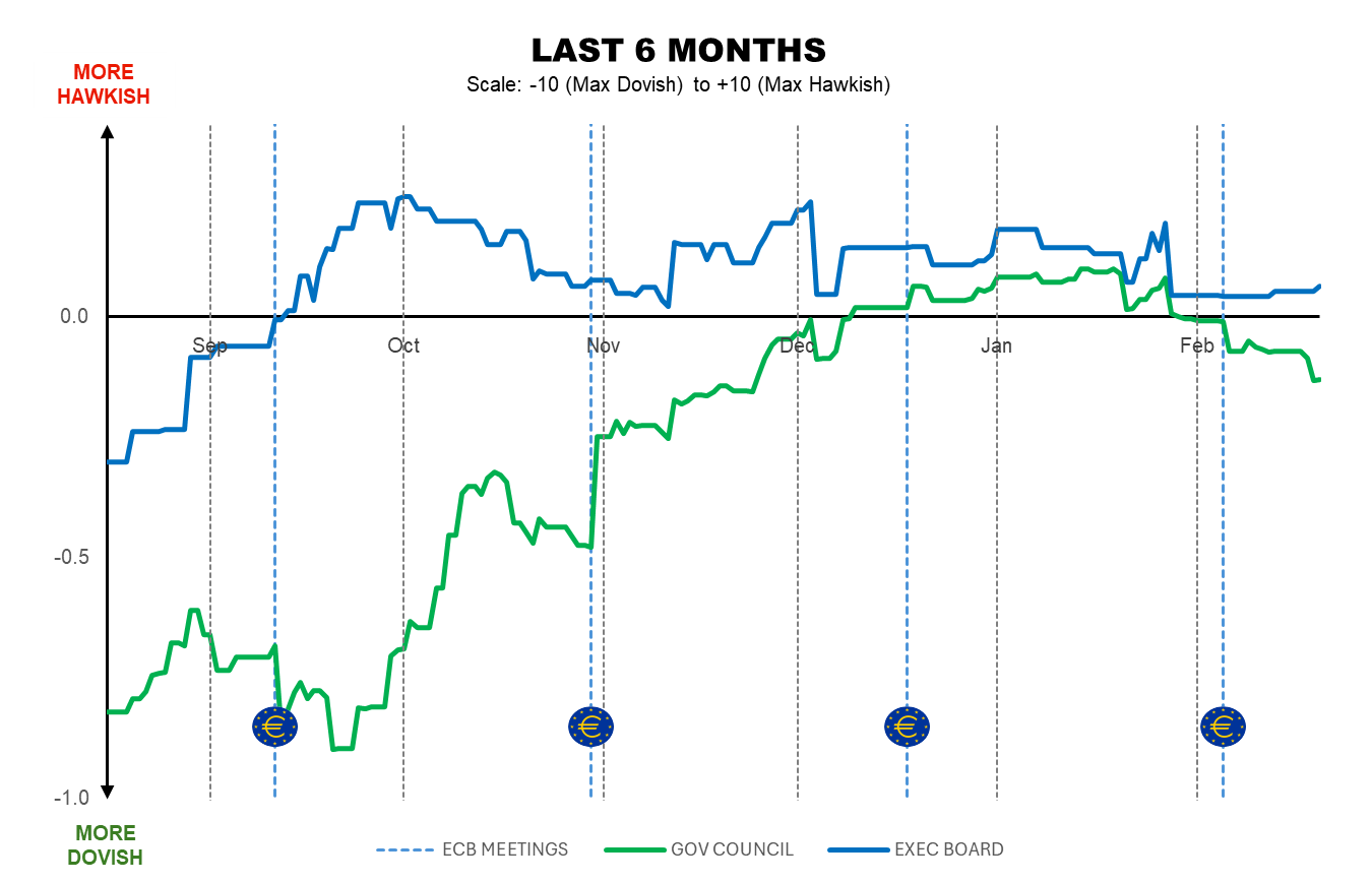 By Marta Vilar – MADRID (Econostream) Econostream’s ECB Tone Meter showed the Governing Council turning marginally dovish this week, while the Executive Board was little changed and remained mildly hawkish.