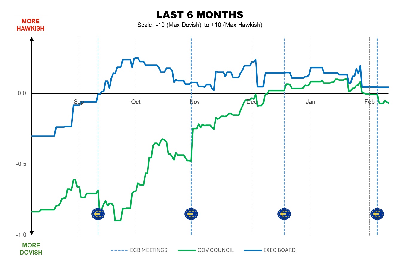 By Marta Vilar – MADRID (Econostream) – Econostream’s ECB Tone Meter showed the Governing Council turning marginally dovish this week, while the Executive Board was little changed and remained mildly hawkish.