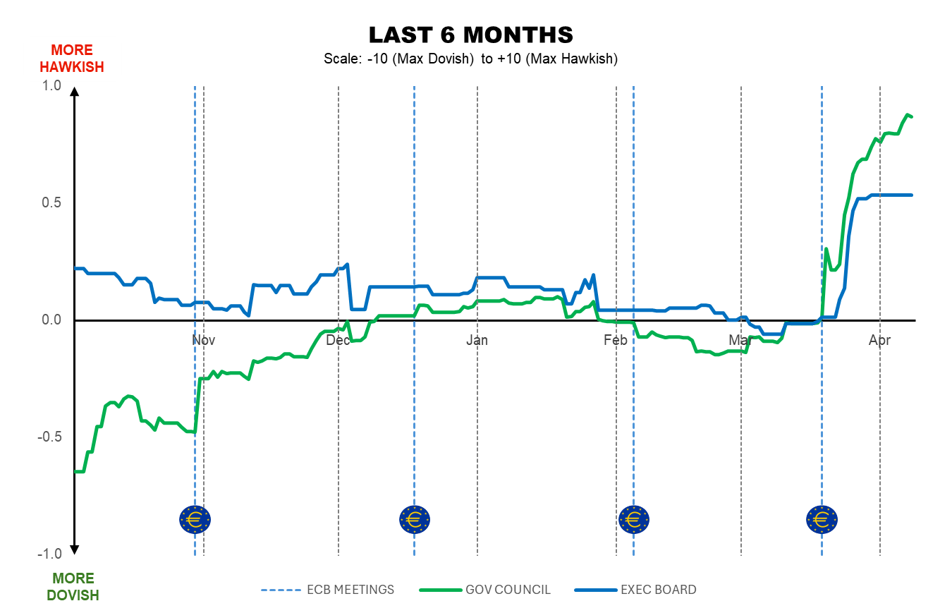 By Marta Vilar – MADRID (Econostream) – Econostream’s ECB Tone Meter continued to rise this week, albeit at a slower pace than last week, remaining in slightly hawkish territory for both the Governing Council and the Executive Board.