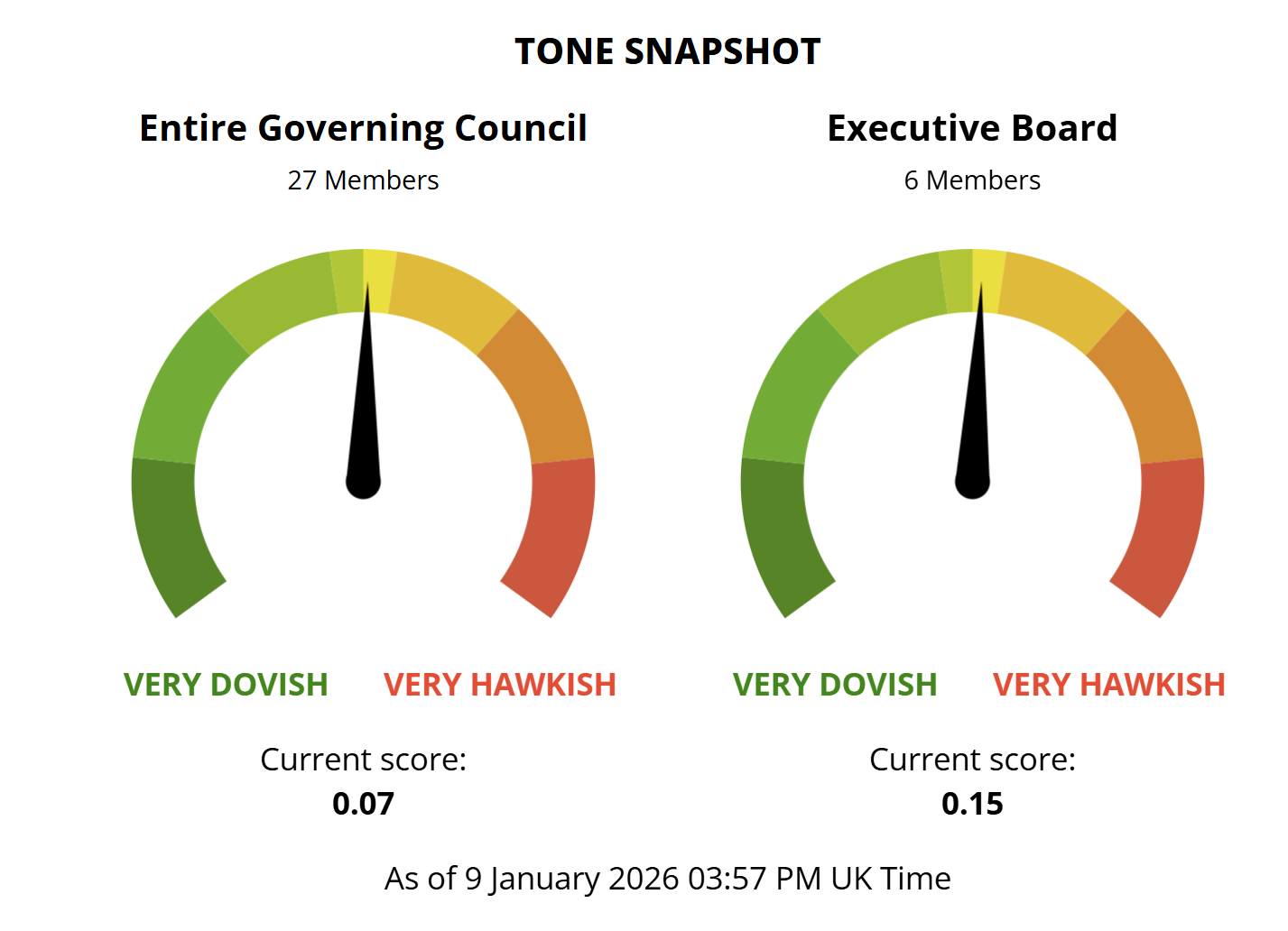 The current reading stands at +0.07 for the Governing Council and +0.15 for the Executive Board, both within our classification of a broadly neutral tone with a slight hawkish bias. This compares with readings on 18 December of +0.01 for the Governing Council and +0.15 for the Executive Board, the latter unchanged.