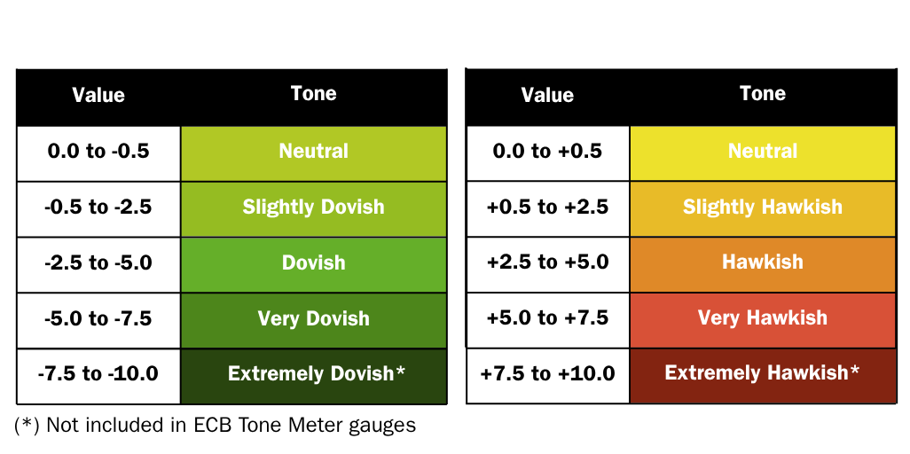 Explainer - ECB Tone Meter Scores: The Tone Meter gauge displays values from -7.5 to +7.5. Technically the values could print outside this range (full scale is -10 to +10) but in practice the composite value rarely approaches these extremes, and a reduced range makes meaningful shifts more clearly visible. In practice, our experience gives the following as a rough interpretation of the values: